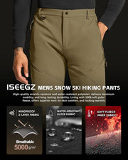 FABRIC: ISEEGZ fleece lined pants men snow, made from high-quality scratch-resistant and water-resistant polyester, three-layer construction softshell stretchy material, this four-way stretch, abrasion-resistant fabric delivers maximum mobility, and long-lasting durability. Men's mountain insulated ski pants, lining with 100% soft polar fleece, offers superior next-to-skin comfort, and locking warmth.
