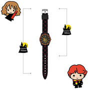 Warner Brothers Harry Potter women's watch with 34mm printed Hogwarts crest dial, black plastic casing, 3-hand analogue display, time-teaching feature, and a fun black and red printed soft silicone strap with traditional buckle fastening. Packaged on a branded backing card and comes with one year guarantee.