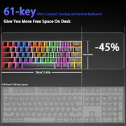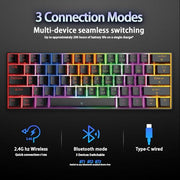 Experience the ultimate in gaming performance with the Infino Wireless Bluetooth Tri-Mode Mechanical Keyboard. Designed for versatility, this keyboard supports 2.4G wireless, Bluetooth, and USB Type-C wired connections, allowing you to seamlessly switch between devices and modes. Whether you're gaming on your PC, working on your tablet, or using other devices, the Infino keyboard adapts to your needs. Illuminate your setup with customizable RGB backlighting. Choose from 22 stunning lighting modes to create the perfect gaming atmosphere, easily controlled with a simple key combination. Adjust the backlight brightness and frequency to match your preference. The brown mechanical switches provide a balanced tactile response, ideal for both gaming and typing, ensuring every keystroke is precise and satisfying. With an ultra-fast response time of ≤5 milliseconds, the Infino keyboard delivers rapid and accurate keystrokes, essential for competitive gaming. Built to last, this keyboard boasts a key lifespan of ≥50 million presses and supports full key rollover to prevent ghosting, so you never miss a command. The built-in rechargeable lithium battery ensures prolonged use. It offers 22 hours of continuous use with the backlight on, 312 hours without backlight, and a standby time of over 10 months. Built with durability in mind, the Infino keyboard features a compact 61-key layout with double-shot injection keycaps made from robust ABS material. This design not only enhances the keyboard's longevity but also gives it a sleek, ergonomic appearance. Upgrade your gaming gear with the Infino Wireless Bluetooth Tri-Mode Mechanical Keyboard and enjoy unparalleled performance, style, and convenience.