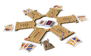 Jackaroo is a popular board game in the Middle East played with cards and pretty marbles. The goal of the game is to get all your marbles to your "base" by moving around the board. Use the cards you have to your team's advantage, but look out for tricks from the opposing team. A very light and simple game, with a hint of strategy, and lots of fun.