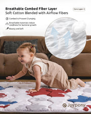 Soft, comfortable, breathable and durable: This baby play mat is made of peach skin fabric, which gives a velvety soft, supple feel reminiscent of the surface of a peach. The mattress is dimensionally stable, wrinkle-free and dirt-repellent, which makes cleaning easier and keeps the colours vibrant. With high-quality polyester cotton filling material that is moisture repellent and hypoallergenic, it provides your baby with a safe and comfortable play area
