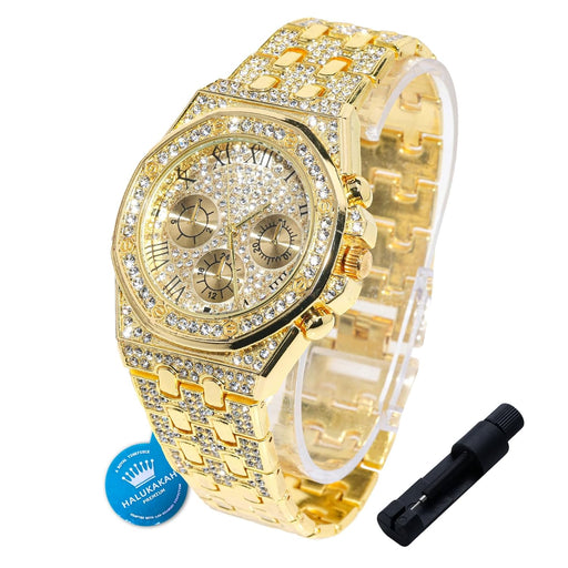 View full detailsHalukakah Diamonds Watch Iced Out for Boy Teens Kids - 18K Real Gold/Platinum Plated,40mm Roman Numerals Octagonal Dial,Japanese Quartz - 20cm Length -Optional with Cuban Link Chain,with Adjuster Tool