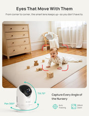 Keep an eye on your baby with intelligent tracking: PTZ 360° tilt and 2X/4X zoom, this baby monitor with camera keeps your child in view no matter where they move. Intelligent tracking and customizable alarm zones ensure peace of mind while your child plays. Audible and visual alarms keep you informed even when your baby is in distant corners.