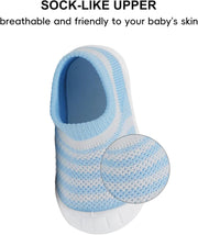 Sock-like Upper - Baby sock shoes made of soft fabric knit which have good breathablity, friendly to the babies' skin, can keep foot comfortable and flexible. Better for first walking baby.