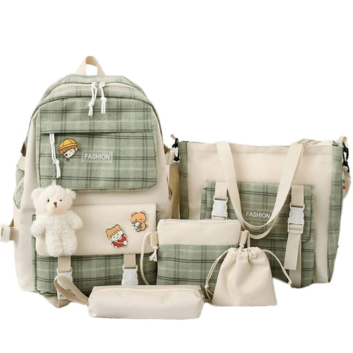 WVHTHVW 5Pcs Backpack School Book Bag Set,Canvas School Backpack Combo Set,Kawaii Bags Kawaii Bookbag Accessories Backpack Cute Aesthetic Backpack for School, Kawaii Girls Schoolbag-Black (Green)