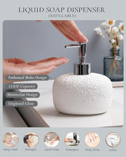 Bathroom Accessories Set with Embossed Design 4PCS, Ceramic White Bathroom Accessory Set, 1Pcs Bathroom Soap Dispenser 14oz, 2Pcs Tumbler Cup, 1Pcs Soap Dish, ANTIS'S HOME