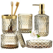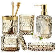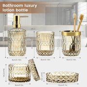 Decostatue Bathroom Accessories Set- 5 Pcs Modern Elegance with Soap Dispenser, Tumbler, Dish, Toothbrush Holder, Cotton Jar Countertop Vanity Organizer for Bathroom Set Glass- Golden