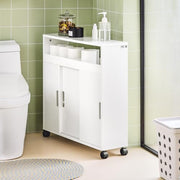 - [Structure of The Movable Narrow Toilet Side Cabinet]: There are 3 main storage spaces of the Narrow Bathroom Toilet Paper Storage Cabinet. There are 2 square slots on the top of the shelf, and there is a space with a door on the left side below where the toilet brush can be placed.