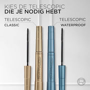 Introducing L'OREAL PARiS Telescopic mascara. In the flash of a stroke…up to 60 Percent longer looking lashes and maximum intensity lash by lash. The high-precision flexible multi-comb is made of supple bristles that help give a precise application. The flat surfaces of the multi-comb stretches the formula from the roots of your lashes right through to the tips. 1x Telescopic Mascara 8 ml
