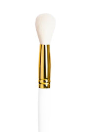 Wayne Goss White Gold Collection Blusher Makeup Brush is long and delicate. With this brush the most pigment products are picked up delicately and placed lightly onto the skin. Perfect for highlighting. It’s a best kept secret for those in the know. Each brush handcrafted by more than 20 artisans from start to finish in Kumano, a region known for its time-honoured brush making legacy. Natural hair bristles are left uncut for unparalleled softness. Bristles are carefully bundled into a matte black brass ferrule to prevent them from coming loose. This construction ensures smooth makeup application. Our handle is carved from hornbeam (or “shide” in Japanese), a hardwood known for its durability and sturdiness. Ideal uses for eye, blending, eyeshadow, face, concealer, powder, buffing, setting. Comes in white brush head, matte black ferrule, gloss black handle. Available in #3 size.