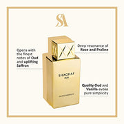 Shaghaf Oud opens with precious strands of saffron, also known as red gold. It merges with the seam of agarwood that starts like the source of a river, and threads itself with growing intensity through each layer of the fragrance. As the oud reaches the heart of the fragrance, it awakens an exquisite rose and nuances of delicious praline. Growing in intensity, the oud meets the warm embrace of vanilla, showering you in the perfect combination of rich, resonant agarwood and golden sweetness.