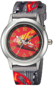 Disney Cars 3 Lightning McQueen Boys' Stainless Steel Time Teacher Watch, Grey Printed Fabric Strap, WDS000296