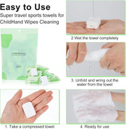 Portable Compressed Towels: Made from soft cotton materials, our travel towel are designed for durability and comfort. These compressed towel tablets expand into large, disposable face towels that are gentle on the skin for face towelettes disposable use, these towels also apply as soap sheets for traveling, ensuring you stay clean and refreshed