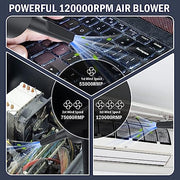 Powerful Deep Cleaning - The Wireless electric air duster max rotating speed is 120000RPM, which can blow strong winds with force of 1.9-2.6 oz, continuously produce high-pressure air to eliminate dust, Clear the dirt hidden in various gaps on the keyboard or any electronic devices, extremely convenient to use in the home, office or car duster.