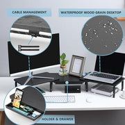 ETHU Dual Monitor Stand ,Double Monitor Riser for PC,Computer, Laptop and Printer,3 Adjustable Shelf Length and Angle Desktop Stand Organizer with Phone Holder and Drawer,Office Accessories Black