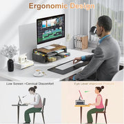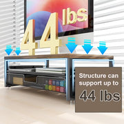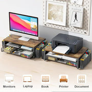This multifunctional double-layer monitor stand has ample storage space. It carries a sliding drawer and 2 hanging pen holders, which can easily store your desktop supplies, and can even be used as a printer stand or phone holder.