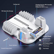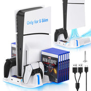 - ãAll in One Designã: Specifically designed for PS5 Slim console 2023 (Disc/Digital Edition), Not compatible with Old PS5 2020 edition. This Cooling Station has efficient suction cooling fans and dual controller charger, LED Charging Indicators, 2 USB Ports, Power Indicator, 12 Game Discs Storage.