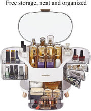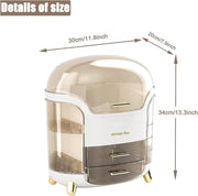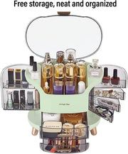 >Large Capacity&Dust &Waterproof: The makeup organizer with lid can store different shapes and sizes of cosmetics while keeping them well organized. Equipped with a transparent lid and drawer to protect your cosmetics from dust and water, the lower two storage drawers can store creams, masks, cosmetics, etc. The side tiered rotating drawers can store lipstick, lipstick, makeup brushes, eyebrow pencils, foundation brushes, beauty tools, necklaces, rings, earrings, etc.