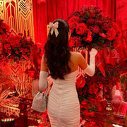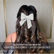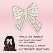 Hair Drama Co. Silver Embellished Crystal Hair Bow Clip With Pearls | Long Tail Hair Bow Barrette Clip | Alligator Hair Barrette for Bride Wedding