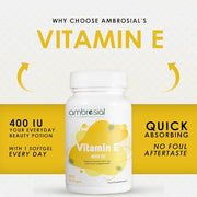 • Comprehensive Beauty Support: Vitamin E has nourishing, anti-aging properties, giving your skin, hair, nails and face a healthy glow; perfect for your skincare routine. It helps fight cell-damaging free radicals preventing premature aging of cells Incorporating Ambrosial Vit E 400IU into your daily regimen is effortless and rewarding, offering you a beauty boost with every capsule.