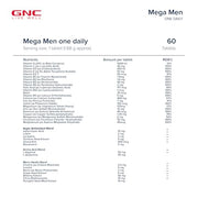 Say YES! to healthier tomorrows with the GNC Mega Men One Daily Multivitamin (60 Tablets). Packed with 32 premium-quality ingredients, this formula provides rich nutrition needed to stay upbeat and energetic everyday. Featuring 100% RDA for 14 essential nutrients, this multi vitamins for man formula is packed with immunity boosters, including Vitamin C, Zinc, Vitamin D3, B-complex, Iron, Biotin, and more to power up your immune system and improve overall health. For enhanced stamina, it also contains a good balance of electrolytes and essential amino acids to boost muscle performance and compensate for the loss due to sweating. This multivitamin tablet contains Choline & Inositol to support brain health and Lutein & Zeaxanthin to protect vision. Being FSSAI certified, GNC Mega Men Sport Multivitamin stays exceptional in terms of quality and reliability.