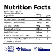 SUPPORT YOUR IMMUNITY Vitamin D3, Elderberries, Zinc, Echinacea, and Garlic are known to enhance immunity. Our spectrum natural blend combines the most effective ingredients to proactively support your immune system. OVERALL HEALTH in powerful blend is the complete formula for immune support and overall health. Immune supports healthy heart respiratory function, promotes skin health, provides vital nutrients, and improves daily stress mood. COLD FLU SUPPORT Our combination of Garlic and Elderberry helps reduce the occurrence of the seasonal common cold and flu as well as reducing the severity of symptoms. POWERFUL ANTIOXIDANTS Vitamin and Elderberry extracts are naturally occurring antioxidants that help reduce stress. Antioxidants that support healthy brain aging and mild memory problems associated with aging. MADE IN THE USA Our formula is NATURAL, ALLERGEN FREE, GLUTEN FREE, and made in facility following strict GMP guidelines to ensure safety and quality.