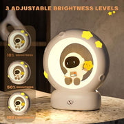 Creative astronaut night light with a unique design featuring an astronaut sitting on the moon, surrounded by stars, creating a romantic and enchanting atmosphere for children's rooms