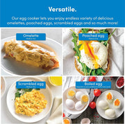 It can cook up to 7 eggs at a time, and offers options for soft, medium, or hard-boiled eggs, as well as omelettes and poached eggs.