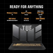 ASUS TUF Gaming A15 FA507NVR-LP023W AMD R7-7435HS/16GB RAM/1TBGB SSD/NVIDIA GeForce RTX 4060 8GB/15.6 FHD(1920x1080) 144Hz/Windows11 Home/1-Zone RGB/English - Arabic keyboard- Mecha Gray