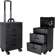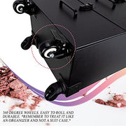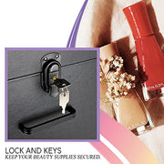 Professional Makeup Artist Train Case Keep all your cosmetics neatly organized! This portable display and storage makeup travel suitcase is perfect for protecting and easily transporting your wide array of bases, foundations, concealers, contours, and highlighters from session to session. You’ll always know where to find the right tool for your next endeavor. This rolling makeup travel box features 2 drawers with ample space for all your tools and beauty supplies, removable foundation holders for up to 45 nail polish bottles, and a removable clear bag to store extra accessories. Its high quality black leather-like finish provides extra protection and durability, and the heavy duty handle offers added comfort and grip. Plus, the easy-close latches with key locks enhance the security of your makeup tools. Designed with the most convenient dimensions to store, carry, and travel: Top compartment: 13.25 x 8.5 x 3.5" Single grid: 1.38" x 1.5" Slide out drawers: 12.5 x 7.75 x 5.75 each Overall case: 13.75 x 9 x 19.25"