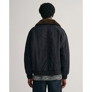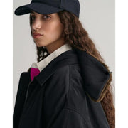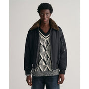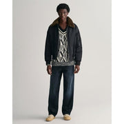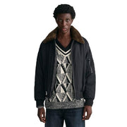 Inspired by vintage, aviator style this bomber jacket is the perfect staple for transitional weather. Treated with a water-repellent finish, this piece is crafted for an oversized fit and finishes right at the hips. The design features a detachable, fake fur collar, side flap pockets with press-button closure, and padded, quilted lining for added warmth and comfort. This garment is intended for an oversized fit. For a closer fit, we recommend sizing down.