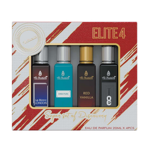 Al Nuaim Elite 4 EDP Gift Set For Men & Women (4 X 20ml) | Le Blanc London | Erba Pura | Red Vanilla | 8PM | Long Lasting Fragrance (Pack of 4)