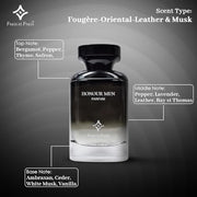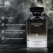 Frais Et Frais Honour Men Perfume is a Fougere & Oriental-Leathery-Musky mens fragrance that harmoniously blends fresh top notes of bergamot and pepper with a rich heart of lavender, leather, and patchouli. The scent evolves into a warm base of white musk, vanilla, and raspberry, creating a captivating foug?re and oriental-leathery profile. Perfect for those seeking a distinctive and alluring signature scent.