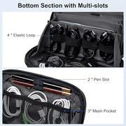 - [Multi-pocket & Multi-slot]The kit bag is divided into three sections, the top and middle sections and the bottom section. Multiple sections make it easier to plan and use. The top part has 3 slots and 3 pockets. The middle section has 2 small pockets for storing a 6.8inch cell phone and (L-16cm*W-4cm*-H-8cm) power bank. Bottom section with 2 pen slots and 4 slots and 2 mesh pockets.Exterior front zippered pocket for storing frequently used small items.