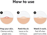 3 Easy Steps: 1) Clean your skin 2) Apply our fast acting Acne Patch and let it do the work for you 3) Remove patch and reveal your results!