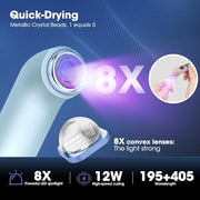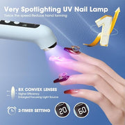 - ???Fast Drying Nail UV Lamp?Equipped with metal crystal beads and an 8x convex lens, our UV lamp offers intense light gathering capabilities for rapid nail drying. It includes 2 timer settings (60 seconds and 90 seconds) that are perfect for curing nail polish, base and top coats, UV nail polish, nail extension gel, nail jewelry gel, and more.