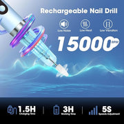 - ???Rechargeable Portable E-Filer for Nails?Tailored for convenience, our electric nail file boasts a high rotation speed of 0-15,000 RPM with 5 adjustable speeds. Whether you're working on soft or hard nails, you can effortlessly adjust the drill's speed to ensure comfort and precision in every use.