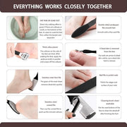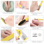 Package Included: 1 * double sided brush 1 * goose egg brush 1 * skirting brush 1 * foot planer 1 * strip rubbing 1 * dead skin fork 1 * cornknife 1 * brush 1 * rubber pad 3 * Blades HOW TO USE PROFESSIONAL PEDICURE TOOLS SET AT HOME? Step 1: Soak your feet first. We recommend soaking your feet in warm water for 10-15 mins to soften skin first. Step 2: Stainless Steel Coarse or Fine File: Polished with rough steel first, preliminary clean dead skin. Step 3: Stainless Steel Callus Scraper: For finer grinding of calluses on the soles of the feet. Step 4: Coarse or Fine File's backside: Use the backside sandpaper to polish the feet after the pedicure again. Step 5: Callus Shaver: Scrapes off dead skin and calluses with a blade on the soles of the feet. Step 6: Two-in-one nail file and dead skin fork: Polish the trimmed nail edge,fork off the dead skin of the hand and foot nail edge. Step 7: Cuticle Pusher: Polish the nail surface to make the foot or nail surface smoother. Cuticle Fork: Used to trim the dead skin around the nails. Step 8: Nail File: Use to polish the nail surface.