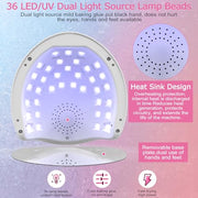 • Fast Dry LED Nail Lamp--The 150W nail dryer consists of 36 highly durable UV LED beads that are rated to last a lifetime (50,000 hours). They are scattered evenly on the top and sides of the lamp to provide faster drying. It is quick and convenient when you want to manicure. The sufficient wattage ensures curing efficiency and shortens time, you can get better curing effect with same time than others