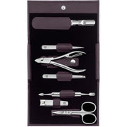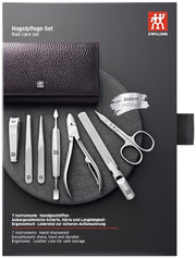 Zwilling Classic Inox 7pc manicure set. Black. Polished Stainless Steel. Set includes nail clipper, nipper, file, pointed & slant tweezers, 2-in-1 combo nail & cuticle scissors, 2-in-1 manicure tool.