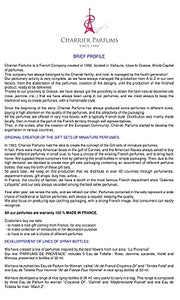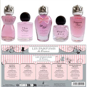 Set of five high quality French perfumes for Women, for a gift or a souvenir of France, presented in a smart box with a see-through lid : 1) Lovely French - Eau de Parfum 12ml. Top note: Bitter orange, Jasmine, Pear - Heart note: Orange blossom, Ginger, Jasmine absolute - Base note: Vanilla, Musk, woody notes. 2) Mon Otage - Eau de Parfum 9,3ml. Top note: Green apple, Tangerine - Heart note: Lilac, Jasmine, Rose, Blackcurrant - Base note: Amber, Musk, Woody. 3) Viva Paris - Eau de Parfum 8,5ml. Top note: Lemon, Orange blossom, Aldehyds - Heart note: Jasmin, Rose, Ylang Ylang - Base note: Oris, Musk, Sandalwood, Vanilla. 4) Magic Rose - Lily of the Valley and Floral Eau de Parfum 10,5ml. Top note: Pepper, Rose, Green Note, Freesia, Violet - Heart note: Lily, Rose, Lily of the Valley, Peony - Base note: Patchouli, Sandalwood, Cedarwood, Musk. 5) Mademoiselle France - Fruity and floral Eau de Parfum 9,4ml. Top note: Grapefruit, Qunice, Wild Violet - Heart note: Jasmine, Lily of the Valley, Iris, Jacinth - Base note: Cedarwood, Musk, Amber. Created by Charrier Parfums, perfumer near Grasse since 1888. Gift box name: Fashion Collection. Content: 5 maxi miniature bottles of Eau de Parfum for Women. Gift box color: Pink, silver. Total perfume capacity: 49.7ml - UK 1.75 fl.oz. Made in France in Vallauris (Provence) by : Charrier Parfums. Charrier Parfums original certified item.