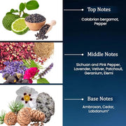 Middle Notes: Sichuan and Pink Pepper, Lavender, Vetiver, Patchouli, Geranium, Elemi