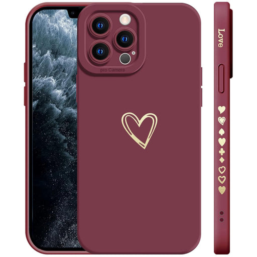 T Tersely Compatible with iPhone 13 Pro Max Case Luxury Gold Heart Pattern Soft Liquid Silicone Shockproof Case for Women Girls Side Cute Plated Heart Pattern Slim Phone Case (Wine Red)