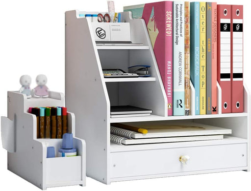TKAS Desktop Organizer Bookshelf Office Storage Rack Adjustable Wood Display Shelf Home Decor Free Style Rotation Countertop Bookcase Office Supplies Desk Organizer Accessories (White)