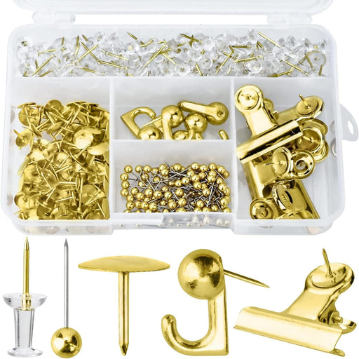 ZELLYA 310 Pcs Push Pins Set, Thumb Tacks Decorative Push Pins Map Head Pin for Cork Board with Push Pin Hook Pushpin Clip, 5 Style Office Accessories for Cork Board Map Office (Gold)