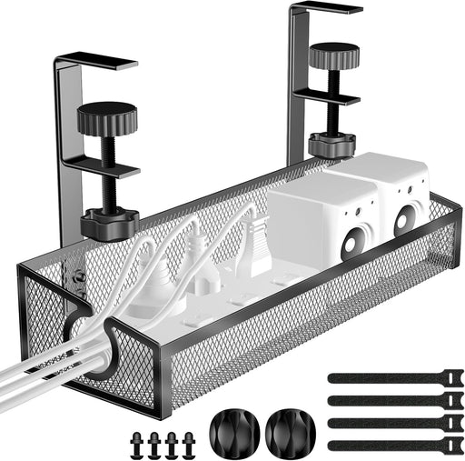 Under Desk Cable Management Tray Black, No Drill Organizer With Clamp for Wire Management, PC Cord Accessories & Workspace Organizers for Office, Home