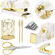 Famassi Gold Marble Desk Accessories, Office Supplies Set Stapler Set Staple Remover, Tape Holder, Pen Holder, 2 Ballpoint Pen, Scissor, Binder Clips, Paper Clips and 1000pcs Staples.