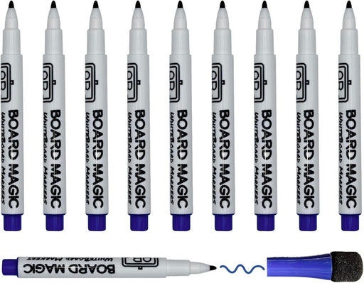 Board Magic Whiteboard Marker, Blue Color, 2 in 1 Magnetic Dry Erase Marker with Eraser, 1-2mm Bullet Fine Tip, Erasable Pens for Kids, Teachers, School, Classroom, Office, and Home (Pack of 10)