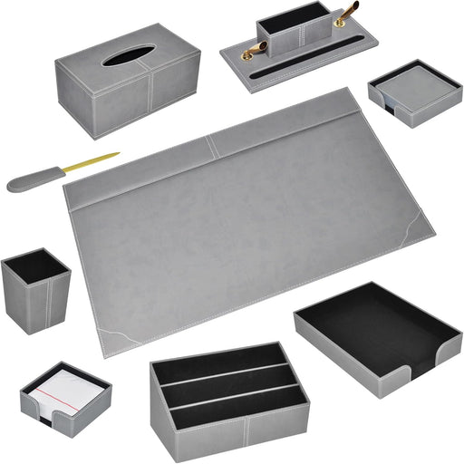 FIS Executive Desk Set with Italian PU Materials, Set of 9 Pieces Desk Set Organizer, Grey Color, Pack in Gift Box-FSDS172GY