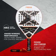 Miguel Lamperti ML10 Quantum 3K racquet A classic in permanent evolution. Awarded for the second consecutive year in 2024 as the Best Hybrid Racquet with dominance of control by Testea Padel, the ML10 Quantum 3K by Miguel Lamperti maintains the iconic rubber HR3 of NOX, now in color. In addition, it incorporates the new Photochromic Paint technology, which consists of a reactive paint in the heart of the paddle that synchronizes with the color of the rubber, offering a harmonious and striking aesthetic.